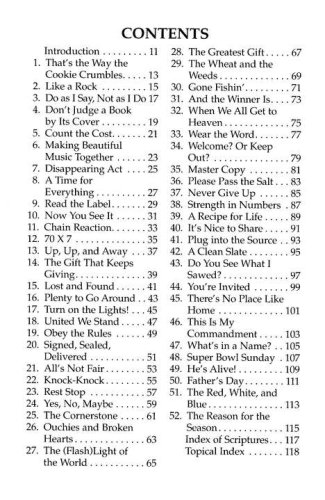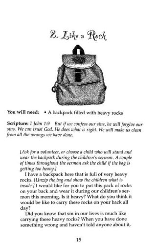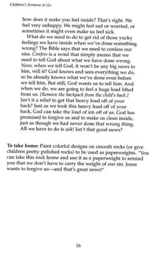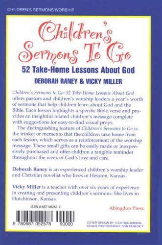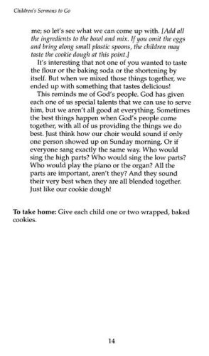 Children's Sermons to Go is a collection of 52 sermons for children. Each sermon first gives a Bible verse and then illustrates that verse with a short anecdote. Each sermon lists easy-to-find household materials the preacher or worship leader can bring to give a visual demonstration that illustrates the truths presented in the sermon. The distinguishing feature of this sermon collection, however, is the small, inexpensive gifts or trinkets – mementos – that each child carries away from the children's sermon, thus giving the children a concrete object that helps them remember the message given in that day's children's sermon.