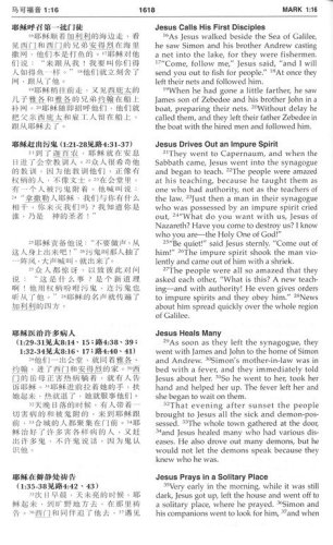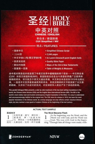 New Testament text of the simplified Chinese script of the classic Chinese Union Version (CUV)New Testament text of the beloved and modern English New International Version (NIV)Table of weights & measures help brings context to the biblical world2-column format8.5-point Chinese type size / 9-point English type size