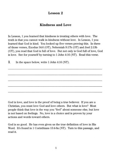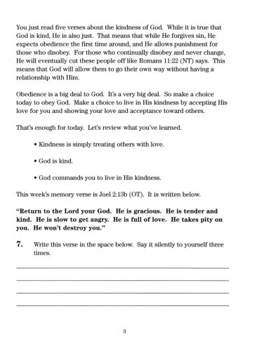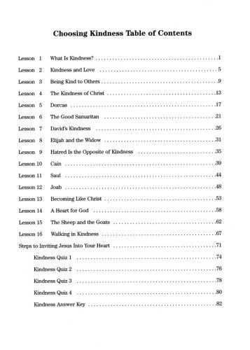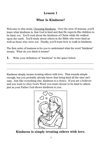 You are so blessed to be studying God's Word as a child. God's Word is filled with treasures and mysteries. With the help of the Holy Spirit, you will learn so much about kindness in the next 16 lessons. Some of the things you will learn from this study are:What Kindness isThat Kindness and Love Go Together The Importance of Being Kind to OthersThe Kindness of ChristExamples of Being in the Bible Who Were KindExamples of Being in the Bible Who Were UnkindHow to Walk in Kindness