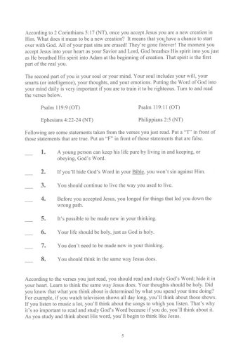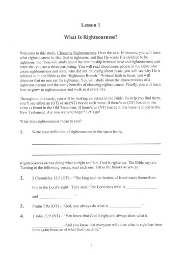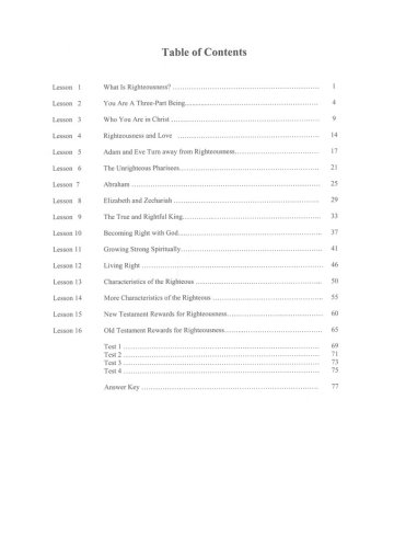 Speaking directly to elementary-aged students, this study focuses upon what righteousness is, and why God wants his children to be righteous. Each lesson contains a brief teaching, followed by Bible activities related to the lesson; an informal tone is employed throughout. Personal reflection questions and comprehension questions based upon the text give variety to each lesson and help students to really understand the importance of choosing righteousness. NIV used. 81 pages, quizzes and answers included. Softcover. Designed for K5-2nd grade with adult supervision, or grades 3-5 for independent work. Non-reproducible, consumable workbook.