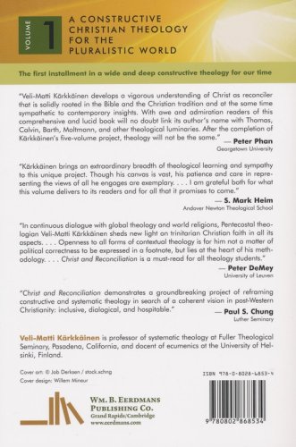 Karkkainen's Constructive Christian Theology for the Pluralistic World is a five-volume project that aims to develop a new approach to and method of doing Christian theology in our pluralistic world at the beginning of the third millennium. Topics such as diversity, inclusivity, violence, power, cultural hybridity, and justice are part of the constructive theological discussion along with classical topics such as the messianic consciousness, incarnation, atonement, and the person of Christ.