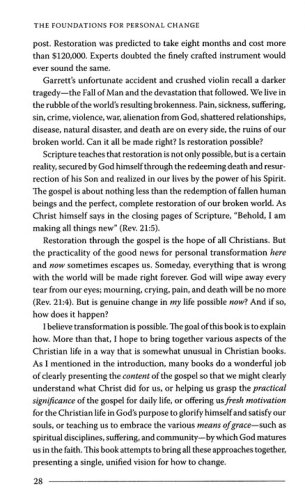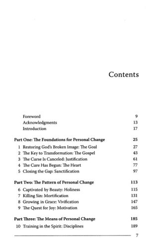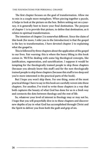 The central claim in Christ Formed in You is that it is God s purpose to change us by progressively making us more like Jesus, and that this happens only as we understand and apply the gospel to our lives. In the pages that follow we will explore the transforming power of the gospel from several angles. Part One focuses on the foundations for personal change. We will look at God s ultimate goal in transforming us (Chapter One); the key to transformation, which is the gospel itself (Chapter Two); and the application of the gospel to our lives in three specific ways (Chapters Three, Four, and Five). Part Two then takes up the pattern of personal change. We will explore the captivating beauty of gospel holiness (Chapter Six); with its demands that we both kill sin (Chapter Seven); and grow in grace by the power of the Spirit (Chapter Eight); and the quest for joy that motivates us in this pursuit and strengthens us in the battle for holiness (Chapter Nine). Part Three of the book focuses on the means of personal change, the tools God uses to transform us. These final three chapters, while building on the foundation of the gospel discussed earlier in the book, are the most practical. We will learn how God uses spiritual disciplines (Chapter Ten); suffering (Chapter Eleven); and personal relationships in the body of Christ (Chapter Twelve) to conform us to the image of Christ. In each of these chapters, my aim has been to connect the dots between the gospel, the goal of Christlikeness, and the specific aspect of spirituality under discussion.