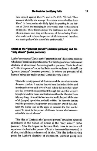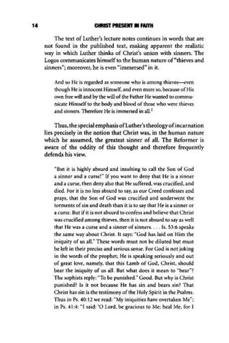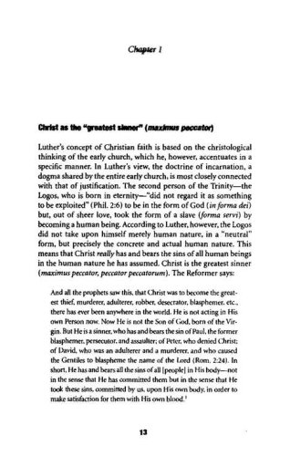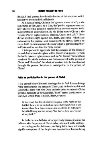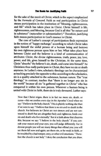 He writes, "the idea of the divine life in Christ which ispresent in faith lies at the very center of the theology of theReformer." He argues that later Lutheran interpretation ofthis teaching has portrayed justification as more mechanicaland forensic than Luther did, underestimated the extentto which God's righteousness is also ours, and obscured theradical personal transformation that Luther attributed tojustification.