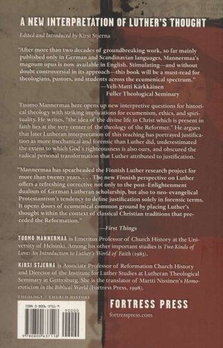 Mannermaa's revisionist work on justification inLuther's theology – a notable contribution from oneof the most influential Finnish scholars of Luther studies – is now available in English. His book opens up newinterpretive questions for historical theology with strikingimplications for ecumenism, ethics, and spirituality.
