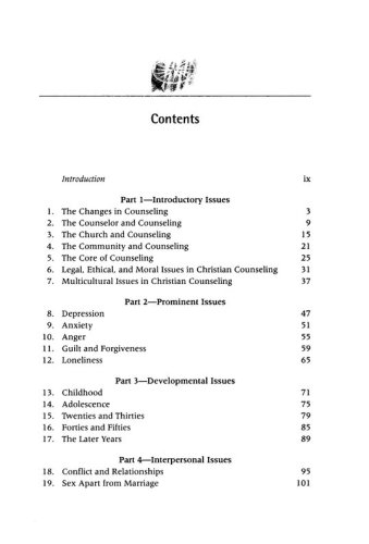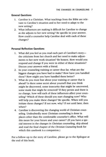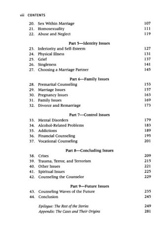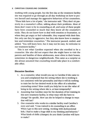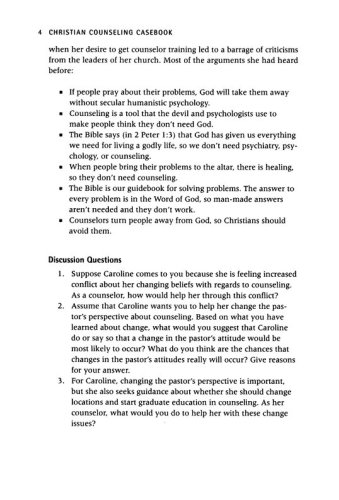 Each chapter begins with a brief introduction followed by the case story or stories and three sets of questions designed by Gary Collins to help the reader or group explore the subtleties and details of Christian Counseling. The Discussion Questions focus primarily on the case and raise questions about how the counselee might best be helped. The General Questions focus more broadly on relevant issues that are suggested by the presented case but may extend beyond the case. The Personal Reflection Questions are written for the reader/counselor to reflect on ways in which the case and the topics under discussion could apply personally to the reader.
