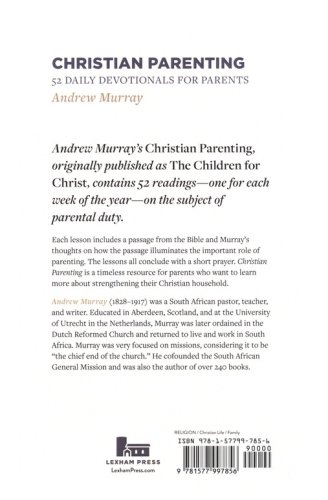 Andrew Murray's Christian Parenting, originally published as The Children for Christ, contains 52 readings–one for each week of the year–on the subject of parental duty. Each lesson includes passage from the Bible and Murray's thoughts on how the passage illuminates the important role of parenting. The lessons all conclude with a short prayer. Christian Parenting is a timeless resource for parents who want to learn more about strengthening their Christian household.