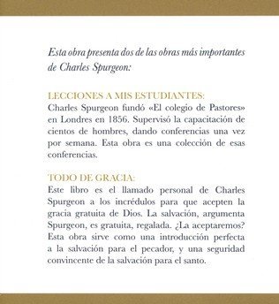 La primera entrega de la serie Clásicos de la fe, presenta dos de las obras más importantes de Charles Spurgeon: Discursos a mis estudiantes: Charles Spurgeon fundó "The Pastor's College" en Londres en 1856, con solo veintidós años de edad. Supervisó la capacitación de hasta ochocientos hombres a la vez, dando conferencias una vez por semana. Discursos a mis estudiantes es una colección de esas conferencias. Conocido como el "Príncipe de los predicadores", el equilibrio entre levedad y gravedad de Spurgeon, bromeando y suplicando, es ampliamente capaz de alentar, condenar y formar pastores y ministros en nuestros días. Toda la gracia: Este libro es el llamado personal de Charles Spurgeon a los incrédulos para que acepten la gracia gratuita de Dios. La creencia de Spurgeon en el poder del evangelio para salvar muestra su presentación clara y abierta del mismo. La salvación, argumenta Spurgeon, es gratuita, regalada. ¿La aceptaremos? Toda la Gracia sirve como una introducción perfecta a la salvación para el pecador, y una seguridad convincente de la salvación para el santo.