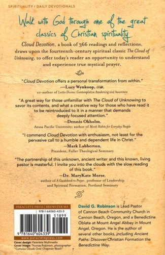 A personal invitation to walk with God through one of the great classics of Christian spirituality. This book of daily devotions is based upon The Cloud of Unknowing. In this edition Robinson sought to remain as true as possible to the voice of this medieval classic. Cloud Devotion follows the original Middle English text sentence by sentence, with Robinson’s own translation and paraphrase, divided work into 366 small portions, with a Scripture passage related to the theme from each daily reading.