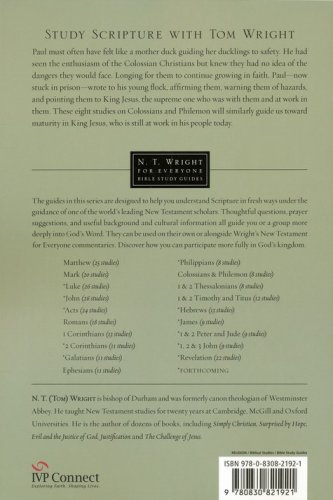 Paul must often have felt like a mother duck guiding her ducklings to safety. He had seen the enthusiasm of the Colossian Christians but knew they had no idea of the dangers they would face. Longing for them to continue growing in faith, Paul–now stuck in prison–wrote to his young flock, affirming them, warning them of hazards and pointing them to King Jesus, the supreme one who was with them and at work in them. These eight studies on Colossians and Philemon will similarly guide us toward maturity in King Jesus, who is still at work in his people today. This guide by Tom Wright can be used on its own or alongside his New Testament for Everyone commentary on Colossians and Philemon. It is designed to help you understand Scripture in fresh ways under the guidance of one of the world's leading New Testament scholars. Thoughtful questions, prayer suggestions, and useful background and cultural information all guide you or a group more deeply into God's Word. Discover how you can participate more fully in God's kingdom.