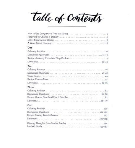 The Comparison Trap 28-Day Devotional is designed to complement the 4-session Comparison Trap DVD study. This deluxe edition features a printed imitation leather binding, a ribbon bookmark, coloring pages, illustrations throughout, and cut-out Scripture verses and recipe cards.
