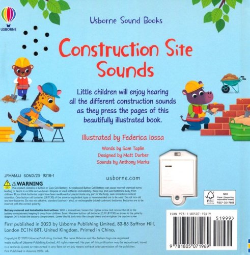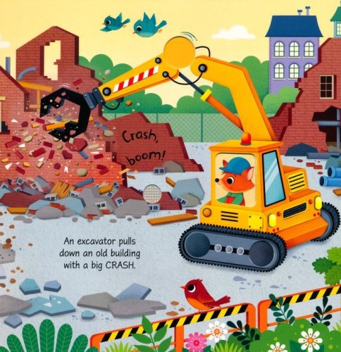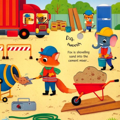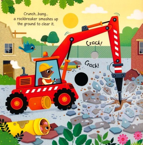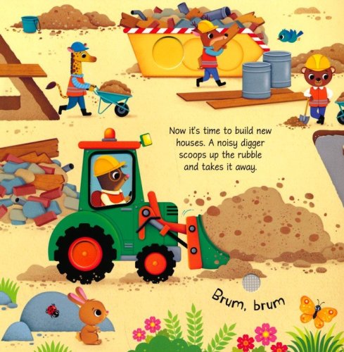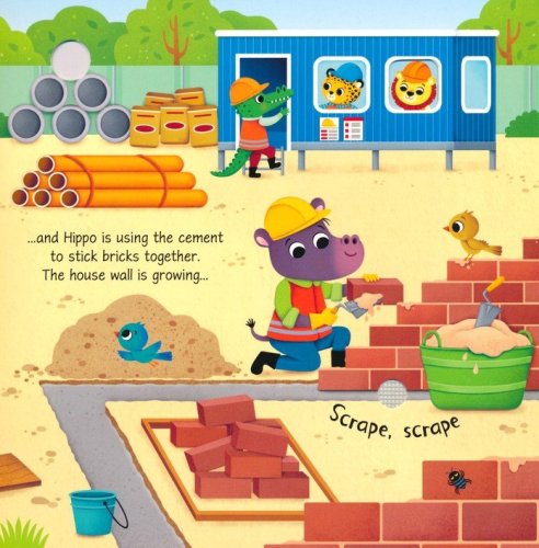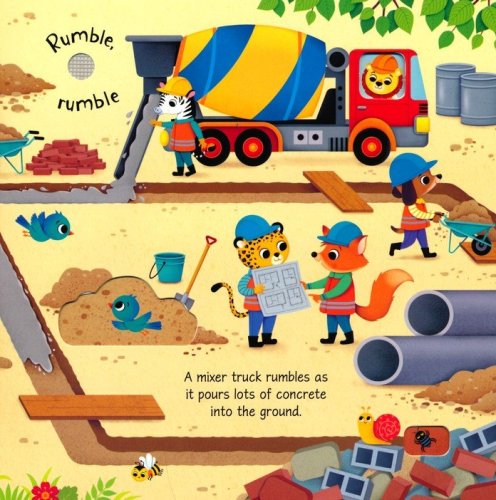 Press the ten buttons in this delightfully illustrated book to hear the construction site come to life. From rumbling diggers and beeping trucks to brick-laying, hammering and sawing, the detailed scenes and evocative sounds show all the different jobs the busy builders do as a new house slowly takes shape.