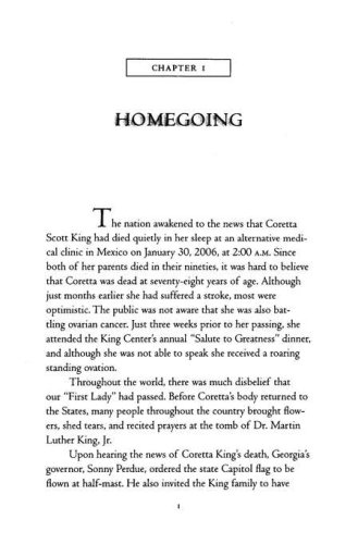 First published in 1970 by Fortress Press, this commemorativeedition has been thoroughly updated, includes a black andwhite photo gallery, and is full of warmth and human interest,telling the story of Coretta Scott King from her childhoodto her death in February 2006.