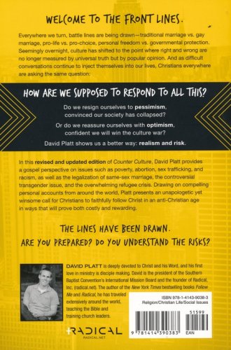 Welcome to the front lines. Everywhere we turn, battle lines are being drawn—traditional marriage vs. gay marriage, pro-life vs. pro-choice, personal freedom vs. governmental protection. Seemingly overnight, culture has shifted to the point where right and wrong are no longer measured by universal truth but by popular opinion. And as difficult conversations about homosexuality, abortion, and religious liberty continue to inject themselves into our workplaces, our churches, our schools, and our homes, Christians everywhere are asking the same question: How are we supposed to respond to all this? In Counter Culture, New York Times bestselling author David Platt shows Christians how to actively take a stand on such issues as poverty, sex trafficking, marriage, abortion, racism, and religious liberty—and challenges us to become passionate, unwavering voices for Christ. Drawing on compelling personal accounts from around the world, Platt presents an unapologetic yet winsome call for Christians to faithfully follow Christ into the cultural battlefield in ways that will prove both costly and rewarding. The lines have been drawn. The moment has come for Christians to rise up and deliver a gospel message that’s more radical than even the most controversial issues of our day.