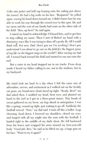 Ben Utecht has accumulated a vast treasure of memories: tossing a football in the yard with his father, meeting his wife, with whom he’d build a loving partnership and bring four beautiful daughters into the world, writing and performing music, catching touchdown passes from quarterback Peyton Manning, and playing a Super Bowl Championship watched by ninety-three million people.