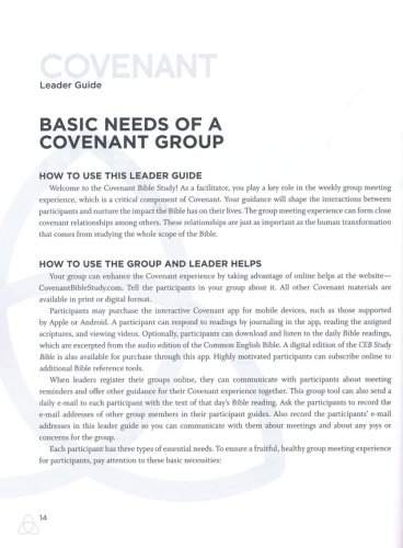 Covenant Bible Study guides small groups through a comprehensive, in-depth study of the whole Bible over twenty-four sessions broken into three eight-session modules. Unlike the learning participants may have experienced in other groups, this study emphasizes the biblical concept of covenant as a unifying theme through both the Old and New Testaments. It underscores the unique relationship that God chooses to have with us as God’s people. This relationship is grounded in the faithfulness of God’s love and on our ongoing commitment to stay in relationship with God while sharing signs of God's love with others.