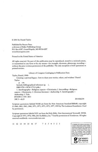 No matter what age or stage of life you're in, creating a spiritual legacy both enriches your own life and blesses the lives of those you love. Chock full of practical guidance, exercises, and examples, this hands-on book helps ordinary people identify wisdom and core values and articulate them in an enduring story form. Taylor promotes the importance of spiritual legacies and shows how to express them not only in writing but also using audio-visual formats and crafts.