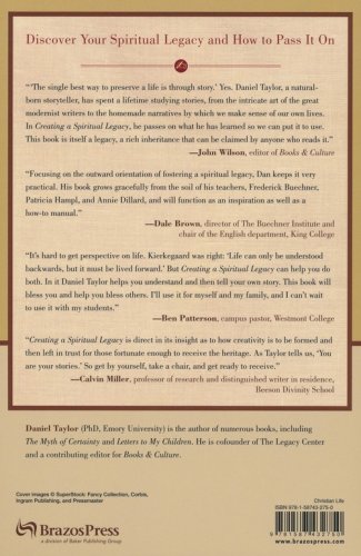 We establish wills to pass on our possessions and property to family members and friends, but what about the things that really matter: our values, beliefs, wisdom, and stories? Those are the things of lasting significance, the things that make up a spiritual legacy. Daniel Taylor, a heralded teacher, bestselling author of Letters to My Children (over 50,000 sold), and a proven master of preserving spiritual legacies, shows how anyone–not just professional authors or those who consider themselves creative–can preserve and pass on their vision of life.