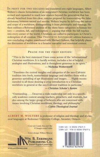 In print for two decades and translated into eight languages, Albert Wolters's classic formulation of an integrated Christian worldview has been revised and expanded to reach new readers beyond the generation that has already benefited from this clear, concise proposal for transcending the false dichotomy between sacred and secular. Wolters begins by defining the nature and scope of a worldview, distinguishing it from philosophy and theology. He then outlines a Reformed analysis of the three basic categories in human history — creation, fall, and redemption — arguing that while the fall reaches into every corner of the world, Christians are called to participate in Christ's redemption of all creation. This Twentieth Anniversary edition features a new concluding chapter, coauthored with Michael Goheen, that helpfully places the discussion of worldview in a broader narrative and missional context.