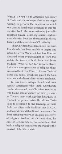 Thin Christianity, as Rauch calls the mainline church, has been unable to inspire and retain believers. Worse, a Church of Fear has distorted white evangelicalism in ways that violate the tenets of both Jesus and James Madison. What to do? For answers, Rauch looks to a new generation of religious thinkers, as well as to the Church of Jesus Christ of Latter-day Saints, which has placed the Constitution at the heart of its spiritual teachings.