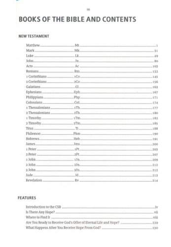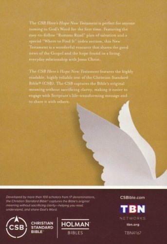 The CSB Here's Hope New Testament is perfect for anyone coming to God's Word for the first time. Featuring the easy-to-follow "Roman Road" plan of salvation and a special "Where to Find It" index section, this New Testament is a wonderful resource that shares the good news of the Gospel and the hope found in a living, every day relationship with Jesus Christ.