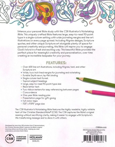The CSB Illustrator's Notetaking Bible features the highly readable, highly reliable text of the Christian Standard Bible® (CSB). The CSB captures the Bible’s original meaning without sacrificing clarity, making it easier to engage with Scripture’s life-transforming message and to share it with others.