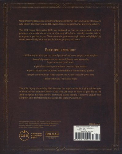The CSB Legacy Notetaking Bible is intentionally designed to leave a lasting and personalized "legacy of faith" for family, friends, and loved ones. This Bible features an easy to read, single-column setting and provides wide margins for journaling and recording notes, prayers, observations, insights, questions, and other reflections about God’s Word. Beautifully crafted covers complete the package, allowing this CSB Bible to stand the test of time with your legacy of learning and growing inside for generations to come.