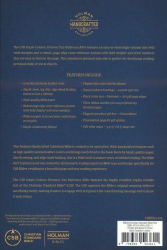 Goatskin premium leather cover Smyth-sewn, lay-flat, edge-lined binding meant to last a lifetime High-quality Bible paper Robust page edge cross-reference system with bold chapter and verse numbers Wide margins to record notes, reflections, or insights Single-column text format Elegant two-color interior design Topical subject headings 9-point type size Black-letter text Footnotes Art gilt page edges Three ribbon markers for easy referencing between pages Elegant two-piece gift box Concordance Presentation page for gift-giving Full-color maps 5.375" x 8.5" page size The CSB Single-Column Personal Size Reference Bible features the highly readable, highly reliable text of the Christian Standard Bible® (CSB). The CSB captures the Bible’s original meaning without sacrificing clarity, making it easier to engage with Scripture’s life-transforming message and to share it with others.