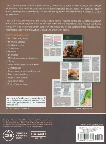 The CSB Study Bible is designed to help you know and be transformed by God's Word. Featuring the highly readable, highly reliable text of the Christian Standard Bible (CSB), this study Bible keeps Scripture primary on every page.To inspire you to grow in your understanding and love for God's Word, the CSB Study Bible includes an award-winning array of study resources including over 16,000 study notes, tools, and word studies-each tool presented on the same page as the verses it refers to. For both deep study and daily reading, the CSB Study Bible is the ideal resource for lifelong discipleship.