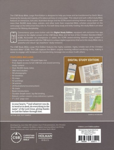 Convenience goes even further with this Digital Study Edition, equipped with exclusive free app access to the digital version of the CSB Study Bible and full text of the Christian Standard Bible® (CSB). Accessible via smartphone or tablet, the ECPA award-winning Holman study system is conveniently paired with the CSB text in a unique digital experience that turns this study Bible into a powerful and robust "go anywhere" study resource.