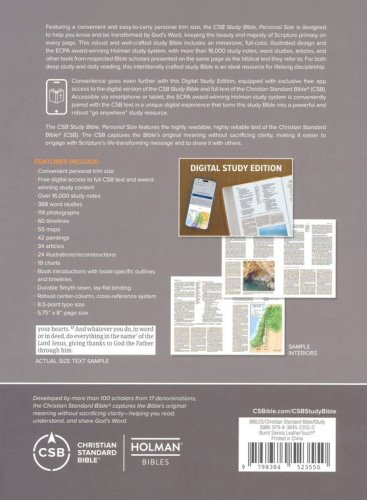 Convenience goes even further with this Digital Study Edition, equipped with exclusive free app access to the digital version of the CSB Study Bible and full text of the Christian Standard Bible® (CSB). Accessible via smartphone or tablet, the ECPA award-winning Holman study system is conveniently paired with the CSB text in a unique digital experience that turns this study Bible into a powerful and robust "go anywhere" study resource.