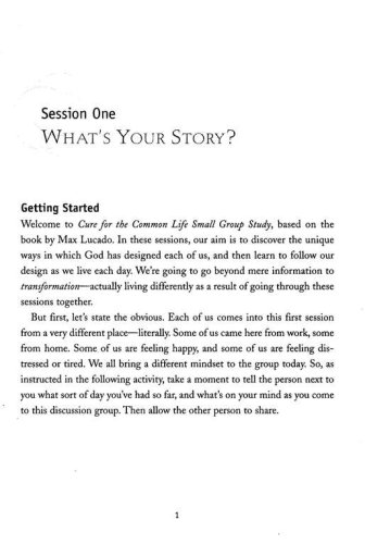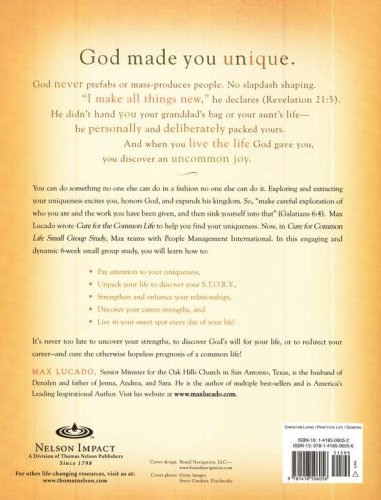 Max Lucado wrote Cure for the Common Life to help you find your uniqueness. Now, in Cure for Common Life Small Group Study, Max teams with People Management International. In this engaging and dynamic 6-week small group study, you will learn how to: pay attention to your uniqueness, unpack your life to discover your S.T.O.R.Y., strengthen and enhance your relationships, discover your career strengths, and live in your sweet spot every day of your life!