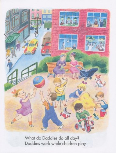 In a charming rhyme, this 1953 Little Golden Books asks, "What do daddies do all day? Daddies work while children play." It shows daddies working in all kinds of careers, from farming to teaching to even singing in the opera! And it assures children that at the end of the workday, "by taxi, train, by car and bus, Daddy rushes home—to us!"