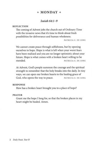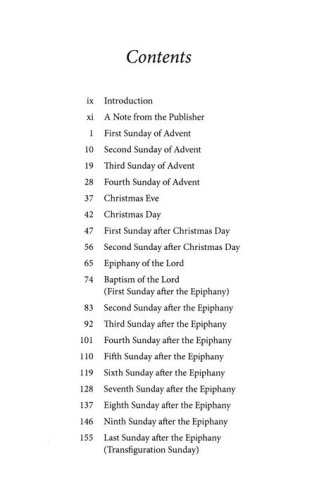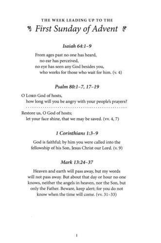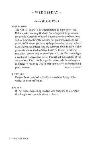 Each day of the week contains Scripture passages for the coming Sunday from the Revised Common Lectionary, excerpts from the commentaries for reflection, a response, and a prayer. Additional material is provided for each Sunday.