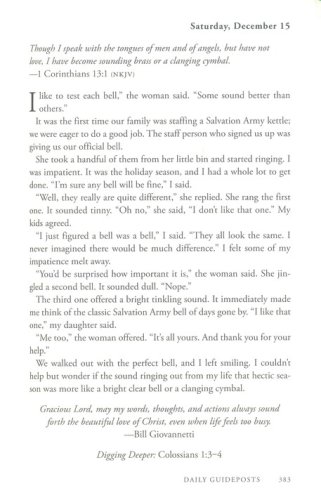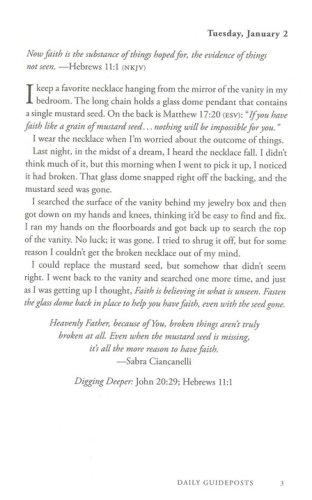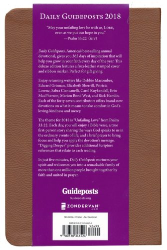 Daily Guideposts 2018 centers on the theme "Unfailing Love" from Psalm 33:22, and is filled with brand-new devotions from 49 writers. Each day readers will enjoy a Scripture verse, a true first-person story told in an informal, conversational style, which shares the ways God speaks to us in the ordinary events of life, and a brief prayer to help focus the reader to apply the day’s message. For those who wish for more, "Digging Deeper" provides additional Bible references that relate to the day’s reading.