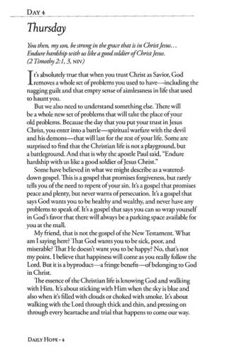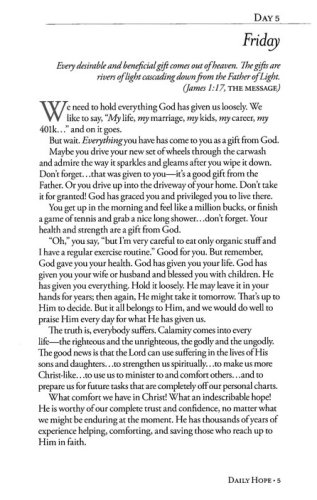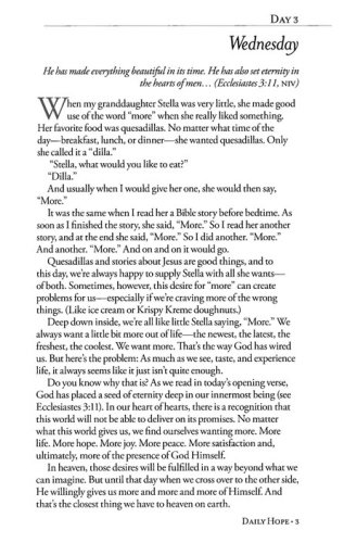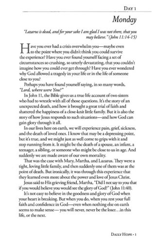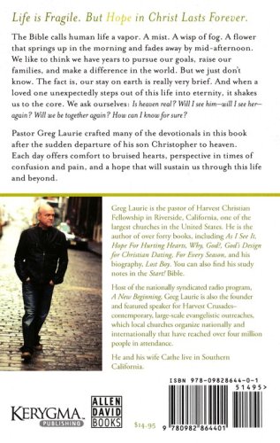 The Bible calls human life a vapor. A mist. A wisp of fog. A flower that springs up in the morning and fades away by mid-afternoon. We like to think we have years to pursue our goals, raise our families, and make a difference in the world. But we just don't know. The fact is, our stay on earth is really very brief. And when a loved one unexpectedly steps out of this life into eternity, it shakes us to the core. We ask ourselves: Is heaven real? Will I see him-will I see her- again? Will we be together again? How can I know for sure? Pastor Greg Laurie crafted many of the devotionals in this book after the sudden deaprture fo his son Christopher to heaven. Each day offers comfort to bruised hearts, perspective in times of confusion and pain, and a hope that will sustain us through this life and beyond.