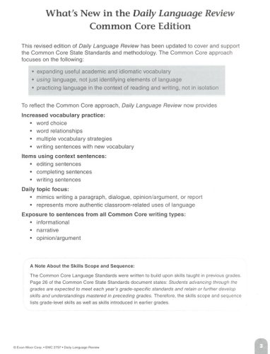 136 reproducible pages, softcover. Grade 7. Answer key included. Correlated to State and Common Core State Standards (CCSS), this edition provides increased vocabulary practice, items using context sentences, a daily topic focus, and exposure to sentences from all Common Core writing genres (i.e. informational, narrative, opinion/argument).