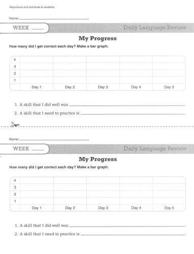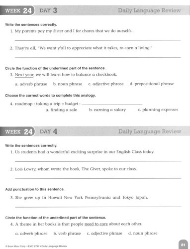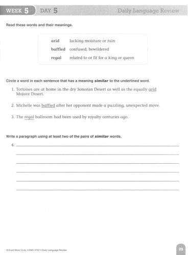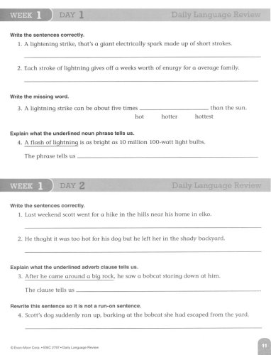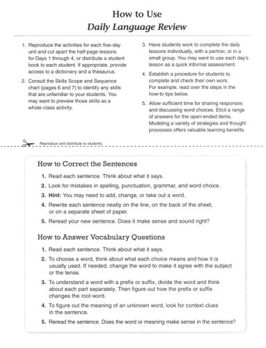 Daily Language Review provides frequent, focused practice to help students learn and retain skills. On days 1 through 4, half-page activities provide four language exercises: two sentence-editing exercises and two exercises that cover a variety of language and vocabulary skills. On day 5, a full-page activity provides more extensive practice for a vocabulary strategy or skill, and gives students the opportunity to practice using the words in their own sentences. Exercises such as editing sentences, filling in sentence completions, identifying parts of speech, completing analogies, and others are included.
