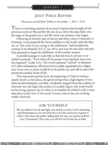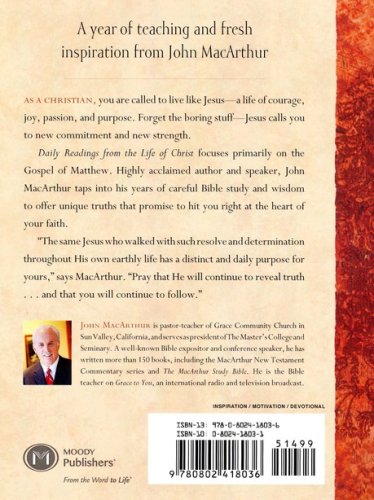 In this first volume of Daily Readings from the Life of Christ, highly acclaimed author and speaker John MacArthur focuses primarily on the Gospel of Matthew, which highlights Jesus as the promised Messiah. Your hungry heart will again be fed and focused on God's Word, with insights on the life of Jesus, thoughts to ponder, and wisdom gleaned from years of MacArthur's careful study.