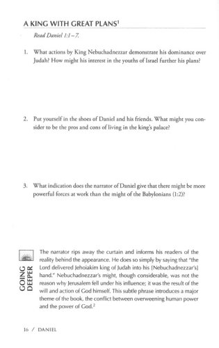 If you want to move from the biblical text to contemporary life on solid ground, this series has been written for you. The Bringing the Bible to Life series, a companion to Zondervan’s NIV Application Commentary, is intended to bring both the historical meaning of the biblical text and its contemporary significance. Each guide provides an introduction to the biblical book, six to twelve sessions with discussion questions, and a closing section that assists the group in responding to God’s Word together or individually. The included Leader’s Guide helps busy people prepare to lead the study. Sessions on Daniel include: • Who’s in Charge? • True Wisdom • Saving Power • Pride Goes Before a Fall • Weighing In • Prevailing Law • The Horror of Human Evil • How Long, Lord? • How Then Shall We Pray? • A Great War