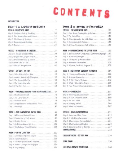 This Old Testament Bible study falls in two parts and can be used as one (12 session) study or two separate (6 session) studies. The first portion, from Daniel chapters 1-6, deals with Daniel's life as he faced the kind of pressures and temptations Christians encounter today. Daniel models how to develop enduring integrity in an enticing world. The second portion, chapters 7-12, explores thrilling prophecies from the time of Daniel through the second coming of Jesus Christ.
