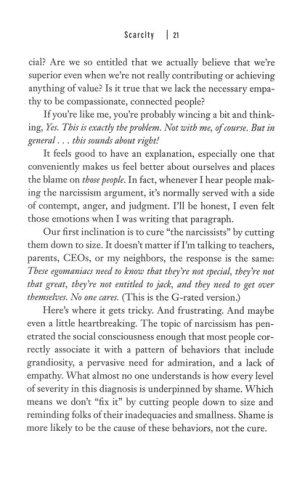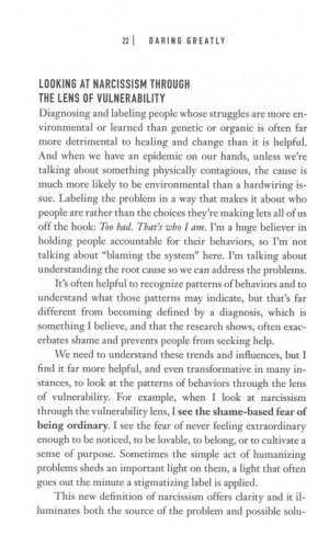 Brown explains how vulnerability is both the core of difficult emotions like fear, grief, and disappointment, and the birthplace of love, belonging, joy, empathy, innovation, and creativity. She writes: "When we shut ourselves off from vulnerability, we distance ourselves from the experiences that bring purpose and meaning to our lives."
