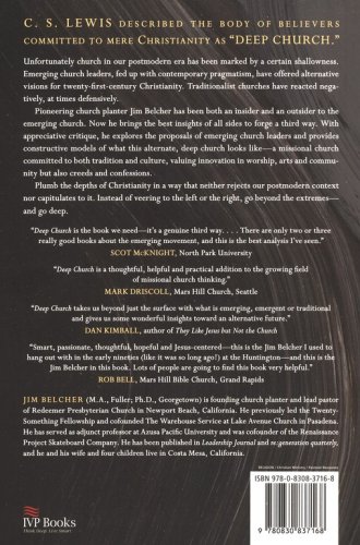 2010 Christianity Today Book Award winner! 2010 Golden Canon Leadership Book Award winner! Feeling caught between the traditional church and the emerging church? Discover a third way: deep church. C. S. Lewis used the phrase "deep church" to describe the body of believers committed to mere Christianity. Unfortunately church in our postmodern era has been marked by a certain shallowness. Emerging authors, fed up with contemporary pragmatism, have offered alternative visions for twenty-first-century Christianity. Traditionalist churches have reacted negatively, at times defensively. Jim Belcher knows what it's like to be part of both of these worlds. In the 1990s he was among the pioneers of what was then called Gen X ministry, hanging out with creative innovators like Rob Bell, Mark Oestreicher and Mark Driscoll. But he also has maintained ties to traditionalist circles, planting a church in the Presbyterian Church of America. In Deep Church, Belcher brings the best insights of all sides to forge a third way between emerging and traditional. In a fair and evenhanded way, Belcher explores the proposals of such emerging church leaders as Tony Jones, Brian McLaren and Doug Pagitt. He offers measured appreciation and affirmation as well as balanced critique. Moving beyond reaction, Belcher provides constructive models from his own church planting experience and paints a picture of what this alternate, deep church looks like–a missional church committed to both tradition and culture, valuing innovation in worship, arts and community but also creeds and confessions. If you've felt stuck between two extremes, you can find a home here. Plumb the depths of Christianity in a way that neither rejects our postmodern context nor capitulates to it. Instead of veering to the left or the right, go between the extremes–and go deep.