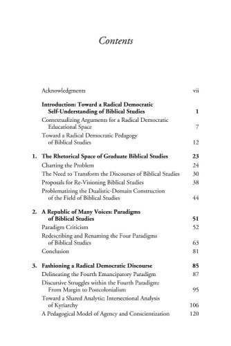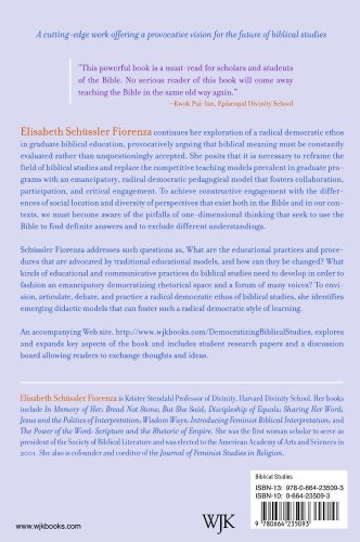 Elizabeth Schussler Fiorenza argues that it is necessary to reframe the field of biblical studies and replace the competitive teaching models prevalent in graduate programs with an emancipatory, radical democratic pedagogical model that fosters collaboration, participation, and critical engagement. To achieve constructive engagement with the differences of social location and diversity of perspectives that exist both in the Bible and in our contexts, Fiorenza argues, we must become aware of the pitfalls of one-dimensional thinking that seeks to use the Bible to find definite answers and to exclude different understandings.