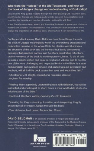 Deserting the King guides readers through the difficulties that the book of Judges can pose for readers as it traces both the evil and redemption present in Israel's approach to kingship–and, by extension, God. And while examining the book's structure and key themes, author David Beldman draws in stories from his life and the world today, showing how this Old Testament book, in its darkness and heroism, gives us a lens to see God's at work throughout history.