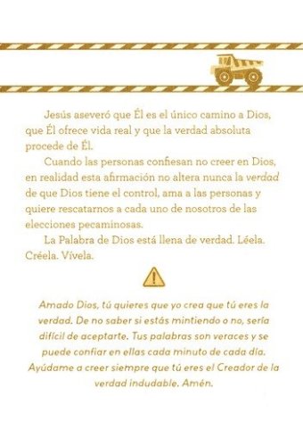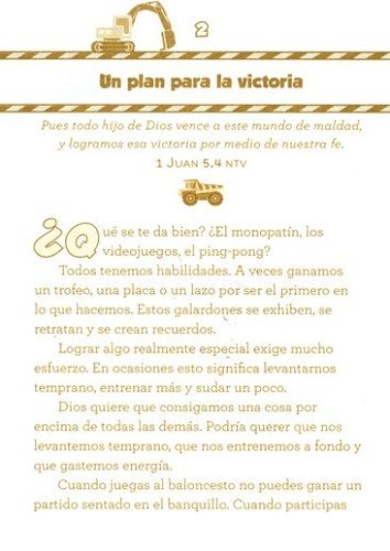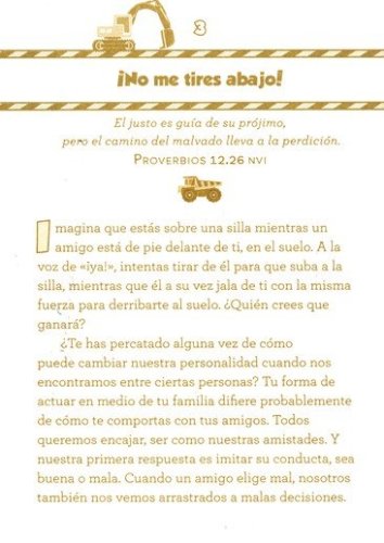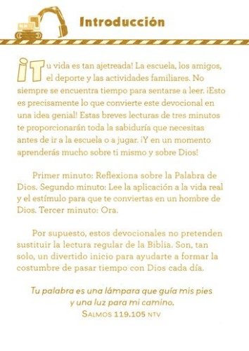 Para muchachos en progreso. Hey, chicos, pueden apartar tres minutos para la Palabra de Dios, sobre todo cuando les llega con una presentación tan divertida y atractiva como Devocionales de 3 minutos para niños. Creado solo para niños de 8 a 12 años, este libro ofrece 90 lecturas que hablan directamente de los intereses, necesidades y sueños que tienen ustedes, "hombres en progreso", con muchas referencias divertidas a los deportes, los videojuegos, los aparatos electrónicos y todas esas cosas que los hacen disfrutar. En tres minutos, puedes 1) considerar un pasaje bíblico relevante seleccionado; 2) leer un devocional que explica la Palabra de Dios a la luz de lo que experimentas en la vida; y 3) leer una oración diseñada para ayudarte a iniciar una conversación con Dios.