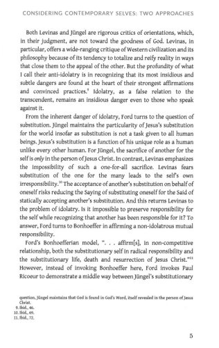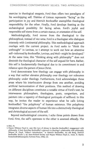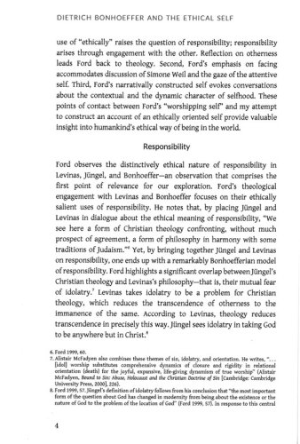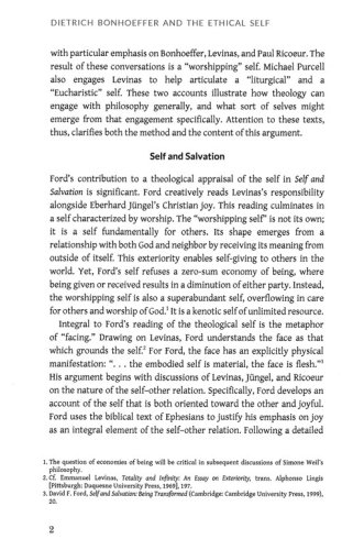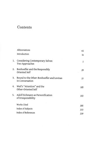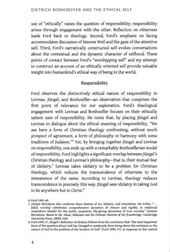 Clark Elliston's Dietrich Bonhoeffer and the Ethical Self not only suggests that a concern for otherness permeates all of Bonhoeffer's work, but also that a constructive vision of Christian selfhood is defined by its orientation towards otherness. With Bonhoeffer as both the origin and point of return, Elliston engages in a dialogue with both Emmanuel Levinas and Simone Weil, both of whom stress the role of the other for self-understanding, albeit in diverse ways. By reading Bonhoeffer "through" their voices, one enhances Bonhoeffer's already fertile understanding of responsibility.