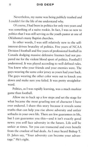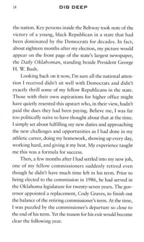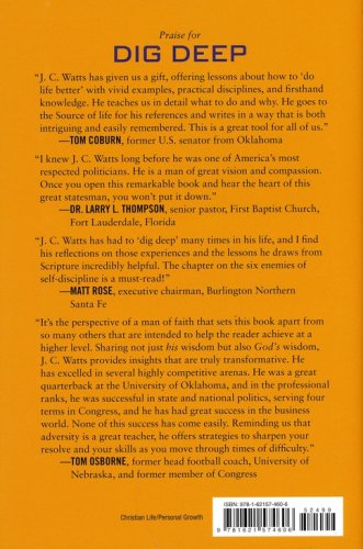 In Dig Deep, J.C. Watts offers seven powerful maxims that have kept him grounded throughout his roller-coaster career from star college quarterback to U.S. Congressman. The first black Republican ever elected to a leadership position in Congress, Watts resisted the rat-race of Washington and eventually declined re-election. His seven simple principles are a blueprint for living a fulfilling and meaningful life without falling to the temptations of reckless ambition or indulgence. Dig Deep is a powerful, simple guide that will help readers find the courage and faith to live the best life possible.