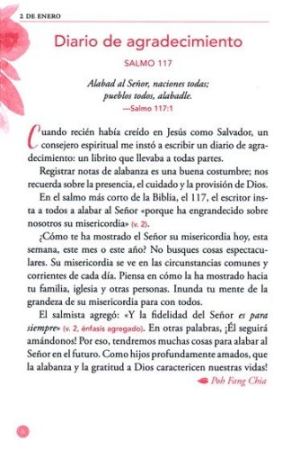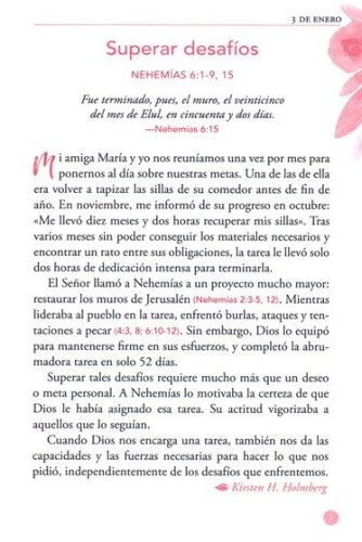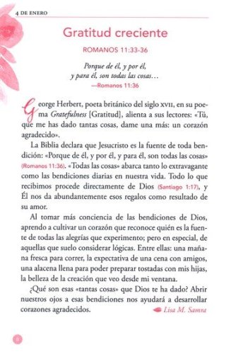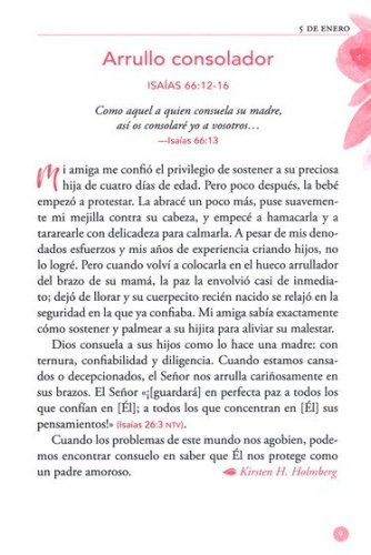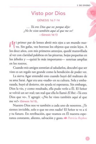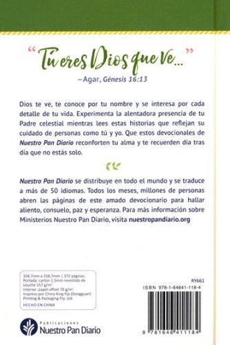 Este hermoso libro para regalar proporciona muchas historias del cuidado de Dios a las mujeres en tiempos bíblicos y en la actualidad. A medida que leas cada día esta colección de meditaciones de Nuestro Pan Diario escritas for mujeres. que te reafirman el amor de Dios, sentirás la cálida presencia de tu Padre celestial a medida que cada artículo te reafirma que Dios te ve, te conoce por nombre y le importa cada detalle de tu vida. El tamaño práctico, el marcador de cinta y la portada decorativa también lo transforman en un regalo perfecto para tus amigas.
