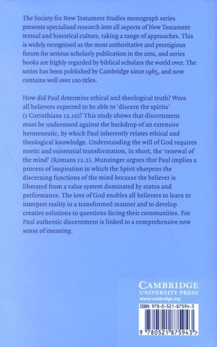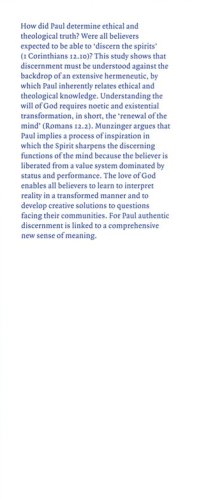 How did Paul determine ethical and theological truth? Were all believers expected to be able to 'discern the spirits' (1 Corinthians 12.10)? This 2007 study shows that discernment must be understood against the backdrop of an extensive hermeneutic, by which Paul inherently relates ethical and theological knowledge. Understanding the will of God requires noetic and existential transformation, in short, the 'renewal of the mind' (Romans 12.2). Munzinger argues that Paul implies a process of inspiration in which the Spirit sharpens the discerning functions of the mind because the believer is liberated from a value system dominated by status and performance. The love of God enables all believers to learn to interpret reality in a transformed manner and to develop creative solutions to questions facing their communities. For Paul authentic discernment is linked to a comprehensive sense of meaning.