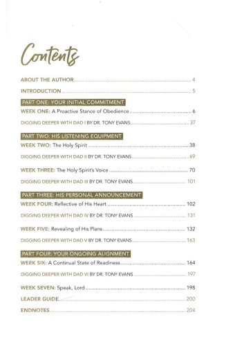 Features:All-new interactive teaching videos approximately 30-40 minutes per session available for rent or purchaseLeader tips in the back of the Bible Study Book In-depth stories and illustrationsPersonal study to be completed among the 7 group sessionsArticles and insights from Dr. Tony EvansExercises to equip you post-studyBenefits:Challenge yourself in the discipline of daily Bible study.Gain practical advice for knowing and understanding God’s voice through His Word.Learn to recognize the Holy Spirit’s character, language, and tone of voice.Experience a deeper relationship with God, and strengthen your daily walk with Him.